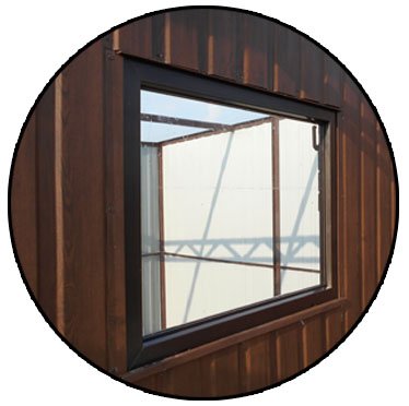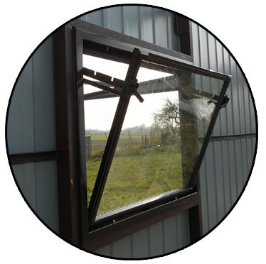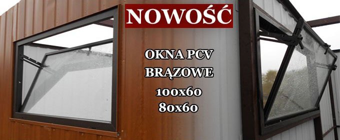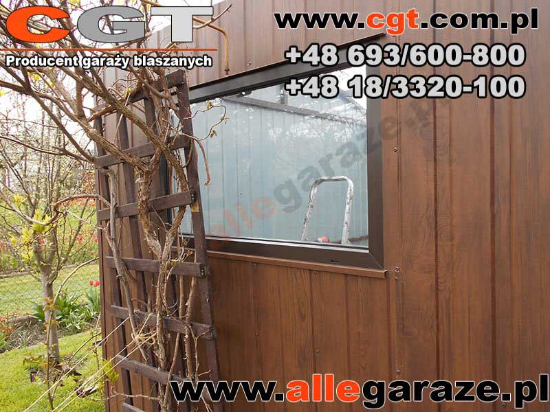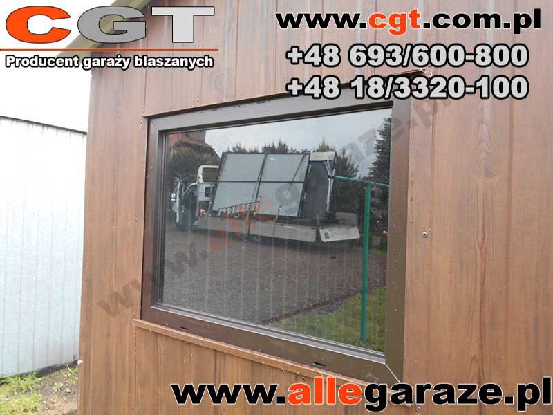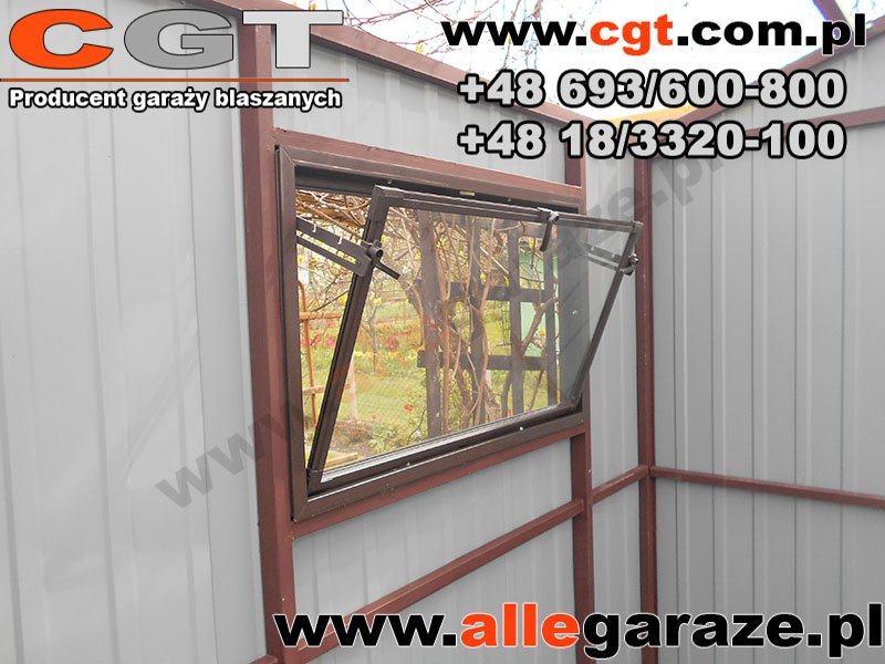 W ofercie naszej firmy od niedawna znajdą Państwo trwałe i estetyczne okna garażowe. W bieżącej sprzedaży oferujemy 2 typowe wymiary okien, większy 100 x 60 cm i mniejszy wymiar 80x60 cm. Okna posiadają plastikową ramę w kolorze brązowym dopasowanym do koloru konstrukcji garażu i pojedynczą uchylną szybę. Cena okna obejmuje wykonanie otworu montażowego, którego umiejscowienie należy ustalić na etapie zamawiania garażu blaszanego. Otwór przygotowany do zamontowania okna posiada solidną ramę wspawaną w konstrukcję garażu a brzegi standardowo wykończone są estetycznymi obróbkami blacharskimi, które maskują linię cięcia i zasłaniają szpary w otworze montażowym.